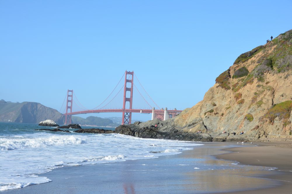 依依不舍地离开Sausalito,按计划我们前往Baker Beach,这是个天体沙滩,我来这之前并不知这个沙滩是天体爱好者的乐园,只是从地图上看到这个角度欣赏金门大桥不錯,纯粹的巧合,但那浑然天成景色, 让你不得不赞叹天体爱好者的眼光,也许那正是他(她)们崇尚自然的审美。在这里,还让我奇遇上了一对年轻新人的婚礼,由于事先未获得他们的许可,有些照片 就不能与大家分享了,这是我亲眼见证的、屈指可数的美妙婚礼之一,婚礼只有夫妻二人加一摄影师,简洁而浪漫,让人羡慕不己!