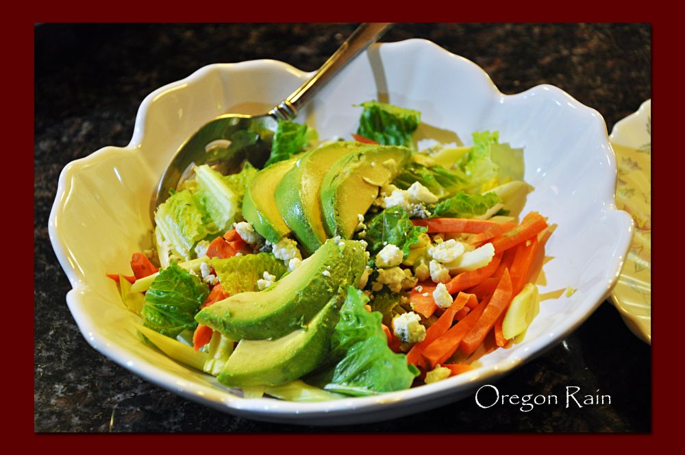 晚上的晚饭吃的一向很简单。今天也不例外。绿色萨拉加blue cheese 和牛油果,配自己做的blue cheese 色拉酱,意大利面(用压面机做的面条)和蘑菇,自己做的面包。