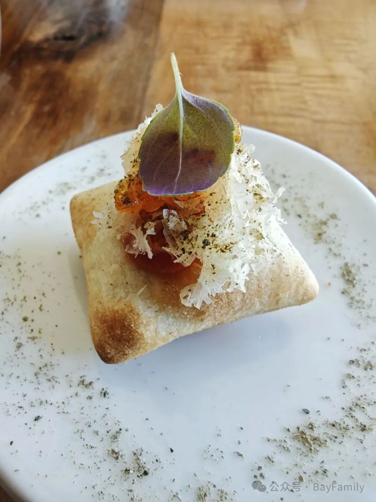 点心开胃菜之后是前菜。前菜一共三道。第一道正式前菜是当地豌豆苗覆盖下配的是鱿鱼和一种酸菜。小面包里面灌的是肉馅和西红柿。