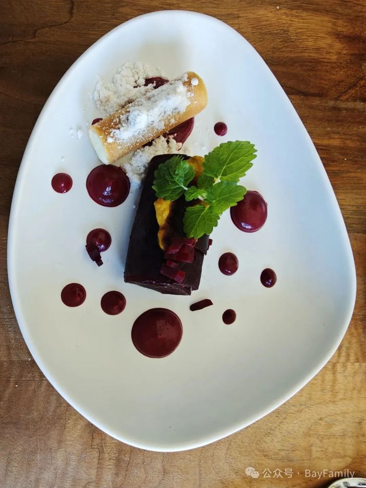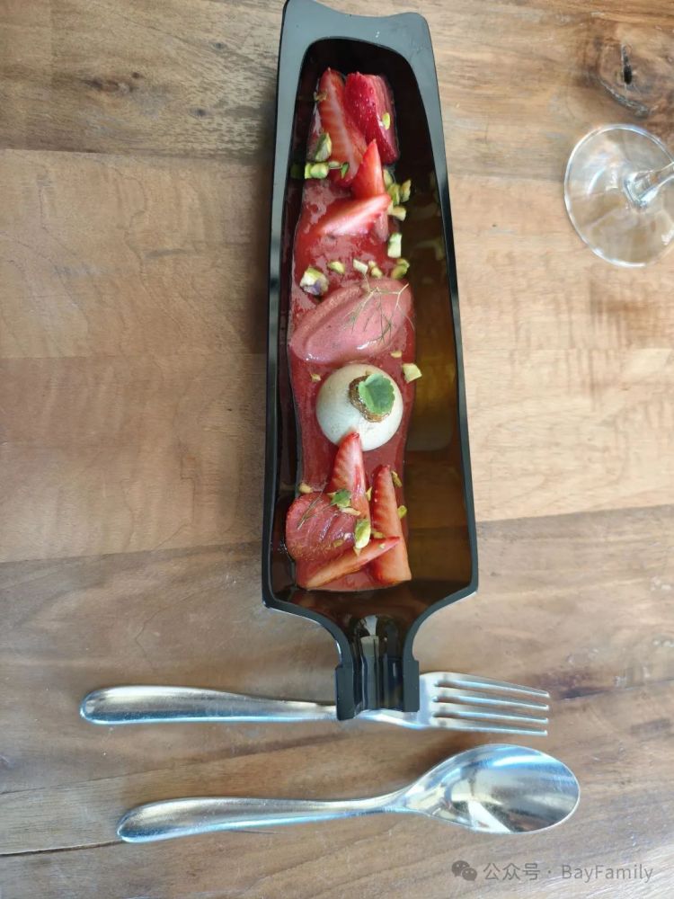 这款酒将和红色水果为核心的甜点搭配。服务员提醒我去细细品尝红色水果的甜度、酸度以及它所带来的清新感。