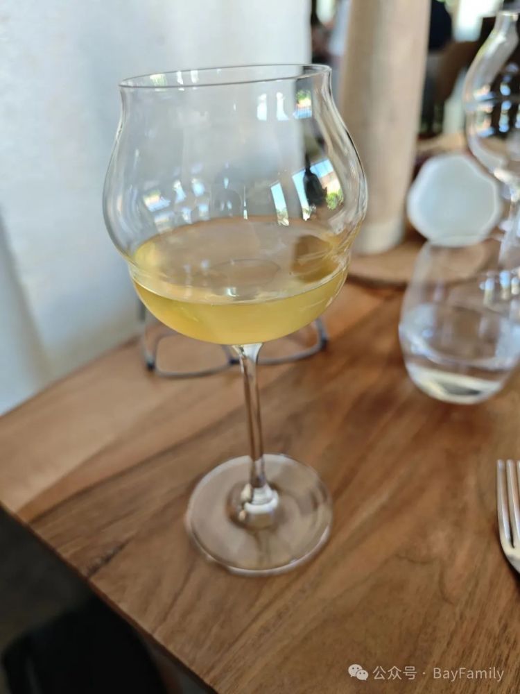 第二道前菜,配这个菜的酒是这个,是一种淡黄色的白葡萄酒。这个酒略微有点酸。