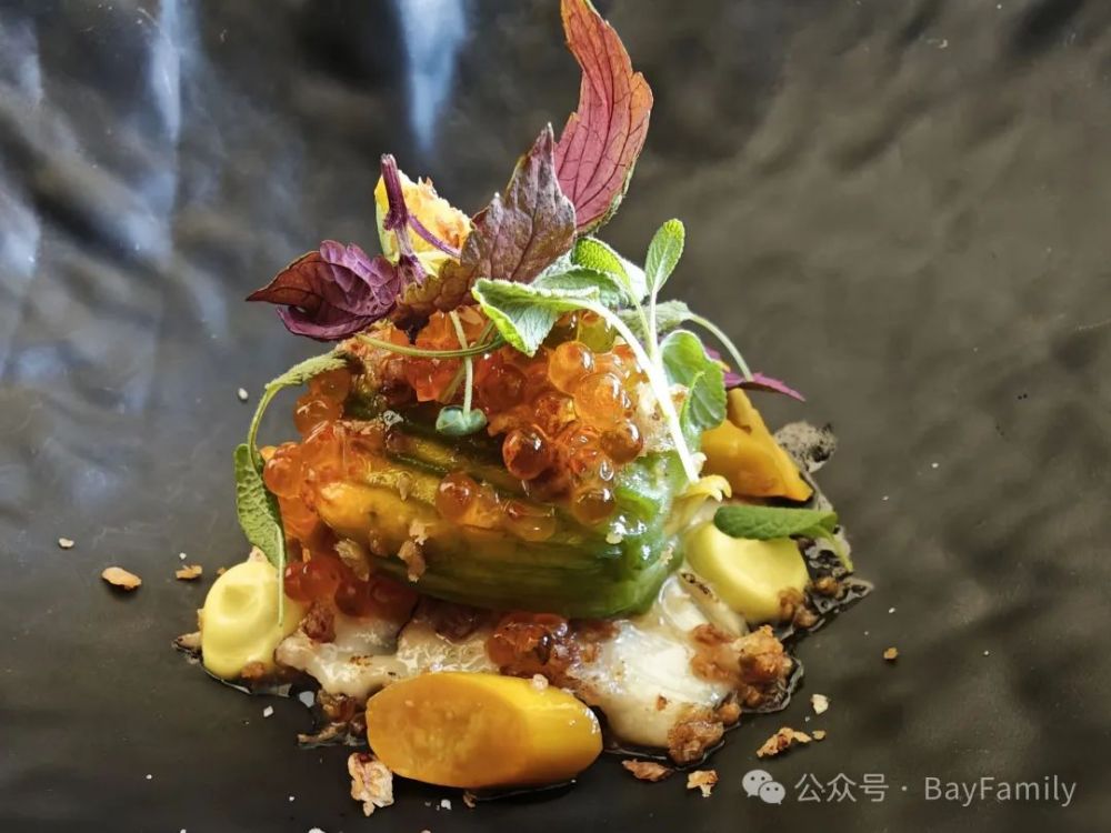随后上的是第三道前菜。这道菜最底下是一层鱼,上面是一个小南瓜,再上面是鱼子。其他是装饰。