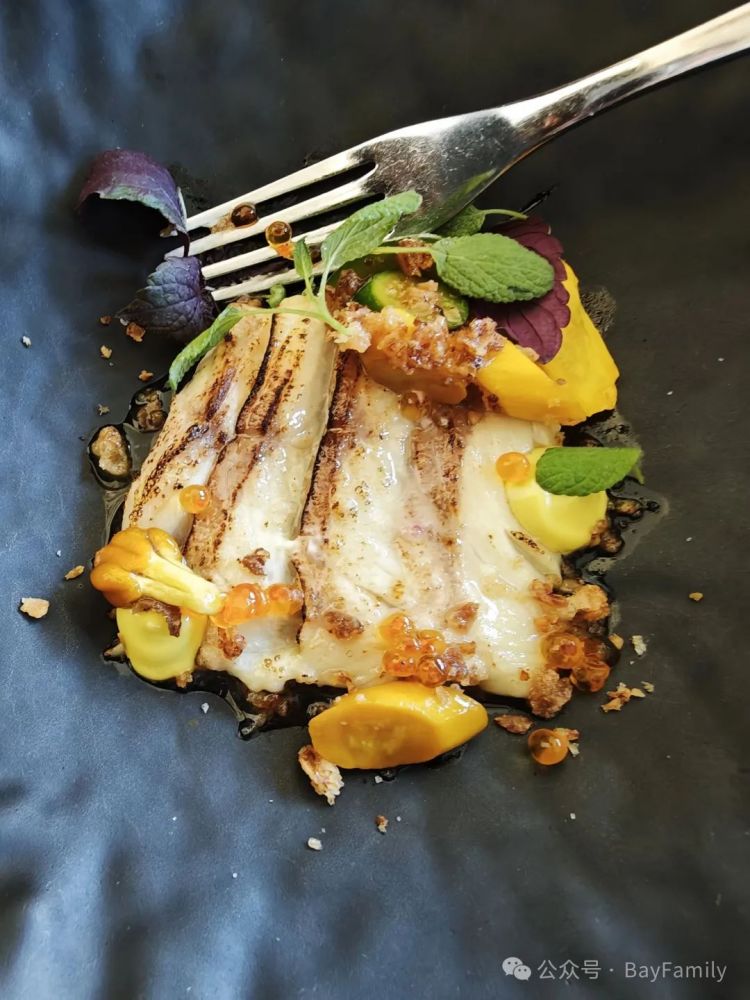 小南瓜很可爱。伴着鱼子一口一个。植物和鱼子的香气扑鼻而来。下面的煎鱼外焦里嫩。鱼叫做北极红点鲑。是法餐高档餐厅里经常用的一种鱼。鱼片前面一半是生的,一半是熟的。厨师控制火候的能力很强。