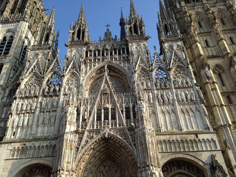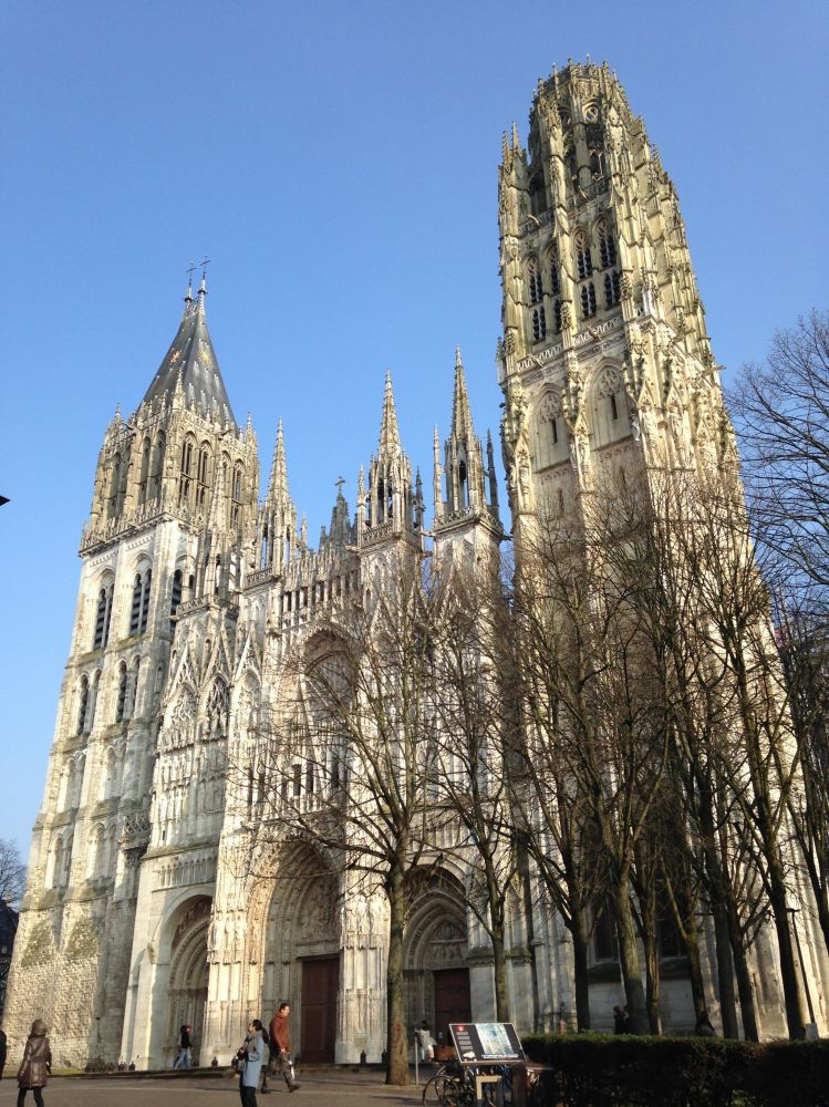 这是我们在去年二月从巴黎出发的三天两夜行。从巴黎火车出发到Rouen,在那里过夜;第二天坐火车到Caen,然后汽车去Mont-Saint-Michel, 在山上过夜。第三天回程,汽车到Rennes,然后火车到巴黎。安排这个行程的原因,一是想要城市结合乡村,看些不同的景致;二是被莫奈画的大教堂和Mont-Saint-Michel吸引。