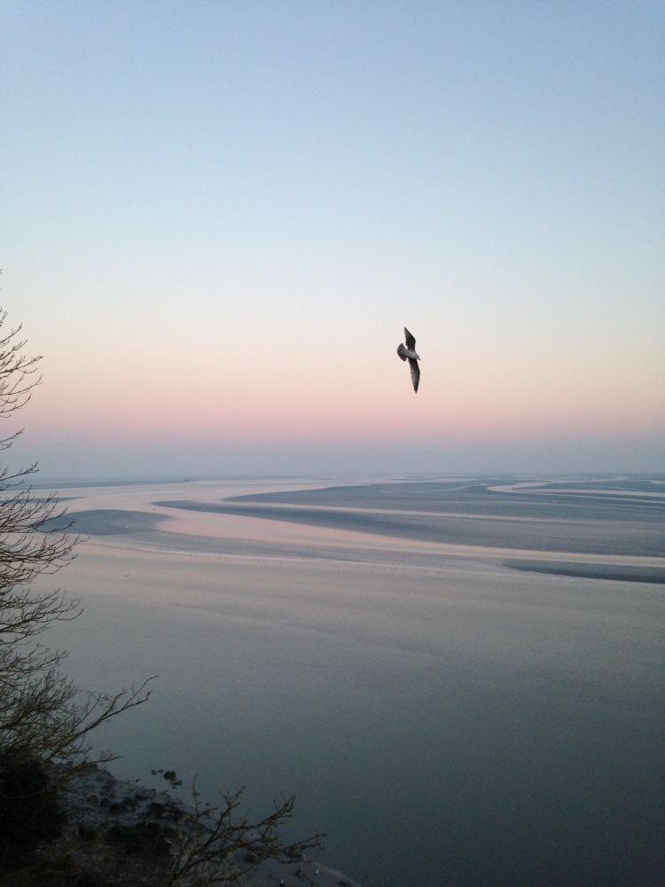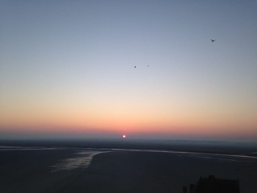 不知不觉汽车开过了一个一个的小村庄,突然眼前一片开阔,女儿轻轻叫起来, 快看!远远地望去, 那一座山,一座城,就矗立在海里。在草地的尽头,沙滩外,Mont-Saint-Michel显得格外醒目。二月不是一个去那儿的旺季,山上没有一点绿色,就是颜色石头和浑浊的海水。 但是好处是没有人拥挤你, 旅店也便宜,我们得以住在了山上的客店里。冬季去的另一个好处是日出时间晚,要8点左右,我们就有机会看到日出。早晨去城墙上看日出, 只有一对老夫妇和我们在那里。日光渐渐呈现,平静的海水缓缓刷着沙滩,海鸟偶尔飞行穿过,那时候“我”似乎已经不在那里了。脑海里没有了我。