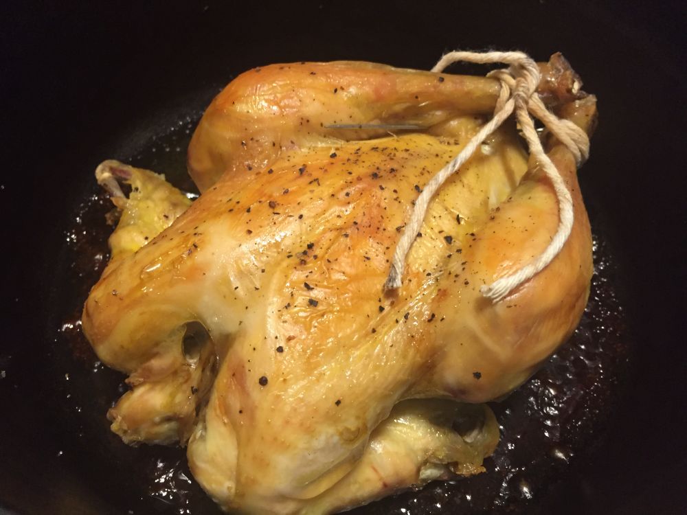 先将烤箱预热220摄氏度(大概375摄氏度,不必太精确)。预热的时候,把整鸡洗净,擦干,涂油,撒点海盐,再撒点胡椒。用厨房针把鸡肚子封好,把腿捆好,胸部超上,放入一个dutch oven,盖上盖子。我用的是我的大黑Lodge铸铁锅。我喜欢这款,因为密封很好。