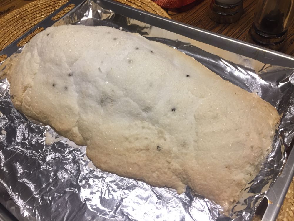 糊上烤上,用去1.5公斤的盐。450华氏度,28分钟,然后拿出来,就这样了。盐块是硬梆梆,必须使劲敲。