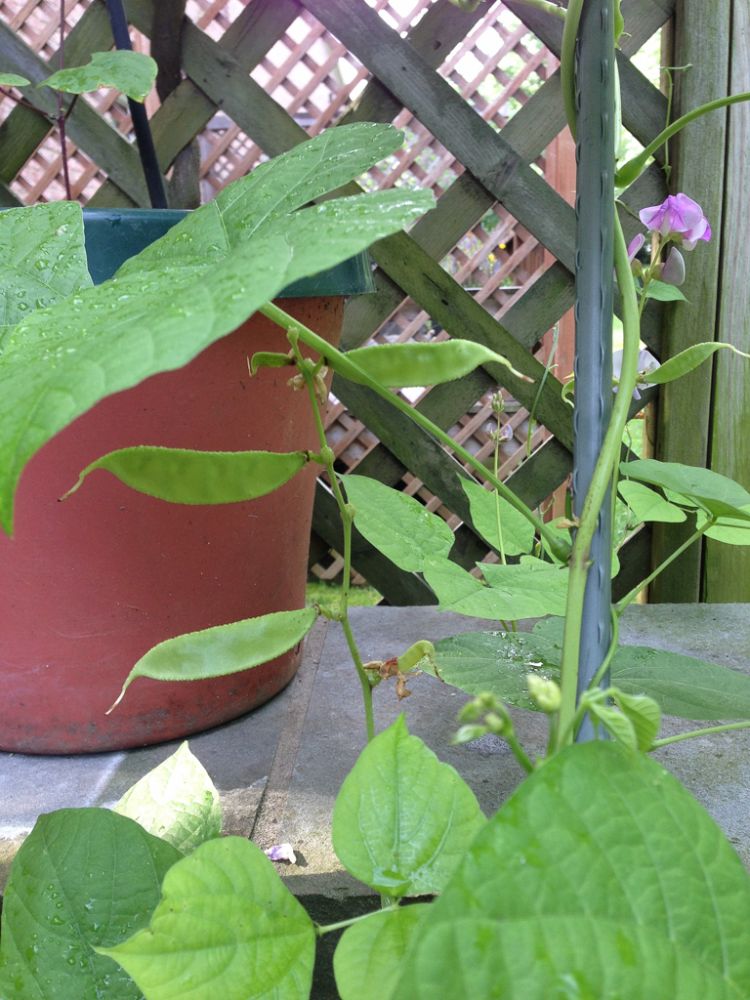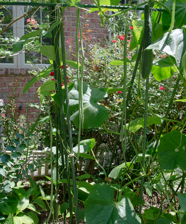 周末到了,早起后按常规计划应该是外出跑步,但仍禁不住出后门到菜园子瞄几眼。看着那一条条挂在青藤上的鲜亮黄瓜和与之相伴的黄花;那一串串吊在枝叶下的嫩绿扁豆及同根生长的紫花;还有那一根根两呎长的豇豆,心中的感受唯两个字可形容 - 舒坦。用LD的话讲,望着菜地比见到亲人还动情。可不是咋滴?自己辛苦耕作的果实呀!