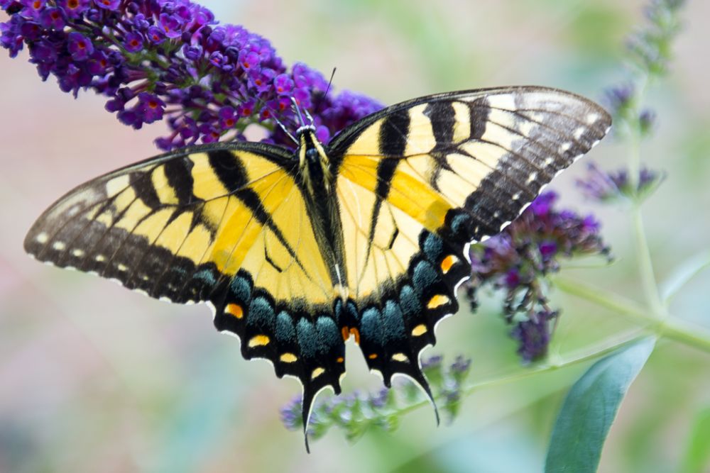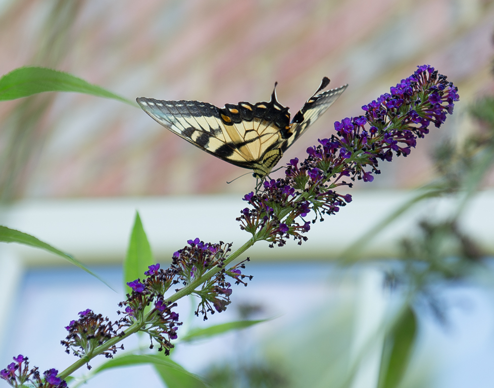 这只蝴蝶在窗外的紫花丛中飞来飞去。偶尔停在一串花上,伸着长长的触角,扭着细细的小腰,双翅时张时合变换着各种姿势。面对这样美妙的场景,这等非凡的演员,观众席上的我岂甘安心就座。赶紧朝屋里轻声喊:拿相机来!随后起身轻步潜入花丛旁,开始了走火入魔的扫射行为。说是扫射实不为过,几分钟内咔嚓咔嚓几十张PP尽收手里。