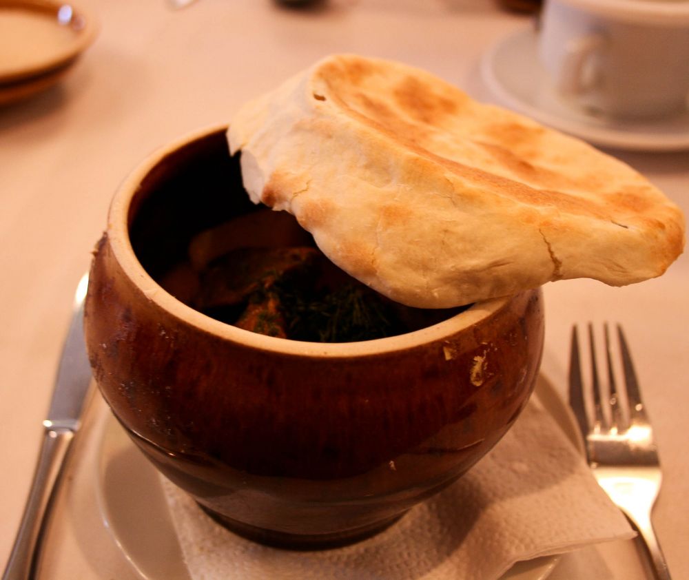 那家叫 My-My (it's pronounced "Moo Moo")的俄式连锁餐厅是排队取饭的自助餐形式。吃客可以向服务员挑选想要的食品。我们反正不懂俄文,看着哪个新奇入眼就乱指一气。黑白面包和加肉面包都很新鲜,羅宋湯和沙拉也很合口。价格非常合理。主食,小菜儿,甜点,连汤带饮料只需300多卢布。我们返回了第二次。可惜当时饥肠辘辘没能拍几张片片。这红菜汤和罐闷牛是在另一家餐厅拍的。
