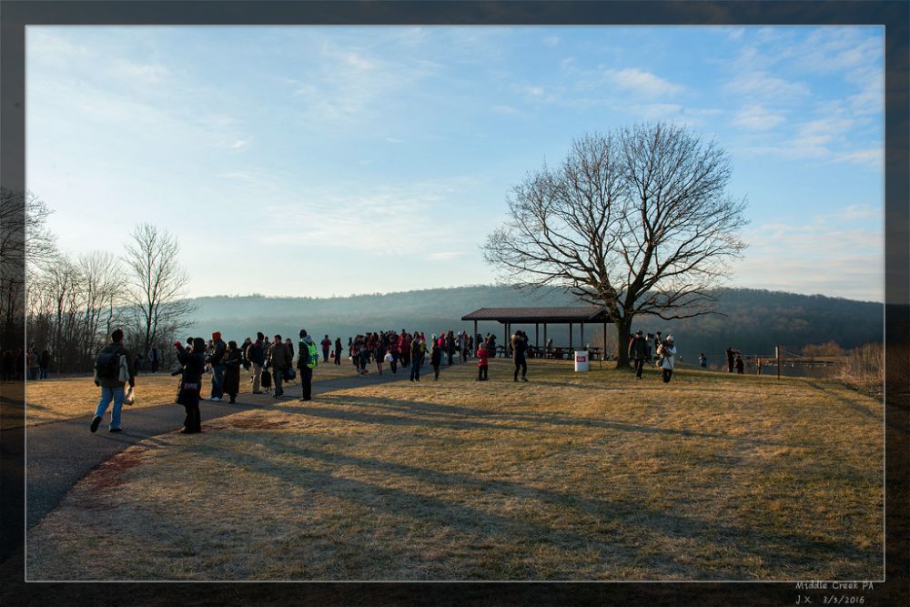 原计划周六中午出发,周日下午返回。这样日落日出两不误还不耽误睡觉。谁知LD临走的前一天反复按小时查看天气预报,说是周日虽然晴天,但清晨日出时分云遮日,太阳要在中午才露脸。他非要周六赶早集,凌晨4点钟就把我从美梦中吼醒了,4点30分摸黑启程,整整开了两个小时。到达 Middle Creek时正是东方见红的美妙时刻。不远处已有一群人围着湖边。我们顾不得查看这是几号景点了(沿湖有7个景点),赶紧找地儿停车奔向湖边,掏出武器对着湖中的一排小黑影先麻利儿的扫了几张。