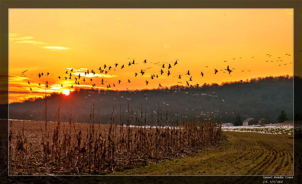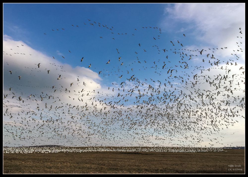 每年二月底到三月中旬是雪雁北迁的季节,数以万计的雪雁从南方飞到此地休息逗留。待养精蓄锐、吃饱喝足之后再飞往北方的家园。据网上统计报道,2015年春季此地群聚过15万只以上的雪雁。今年的2月底已有6万5千多只的雪雁 (Snow geese),3千5百多只的黑嘴小天鹅(Tundra swans)和许多加拿大雁 (Canada geese) 在此逗留。