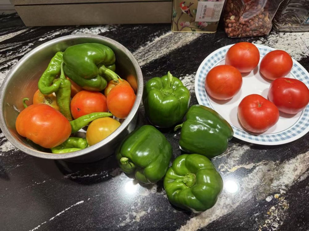 菜地今天的收获,右边的西红柿是这周收的,看到红的就摘