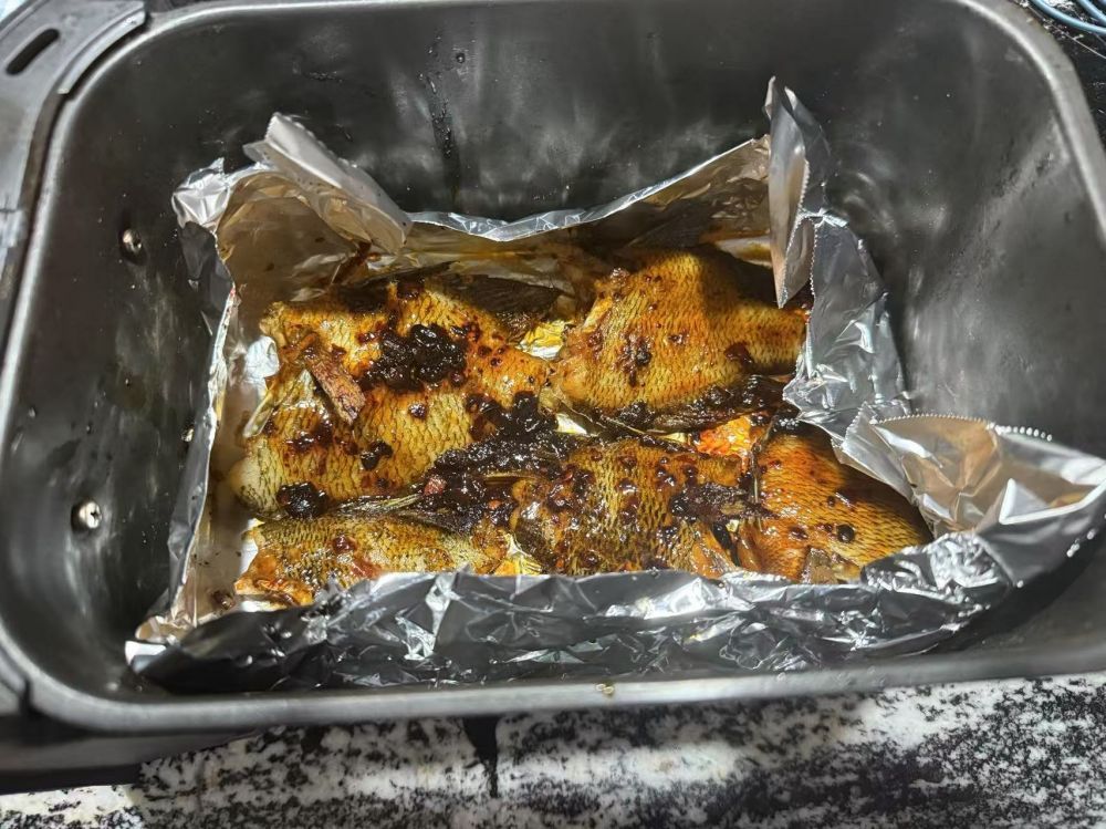 涂上油,空气炸锅每面5分钟,涂上调料(耗油,糖,辣酱)再5分钟,吃起来有点麻烦,但LD很喜欢