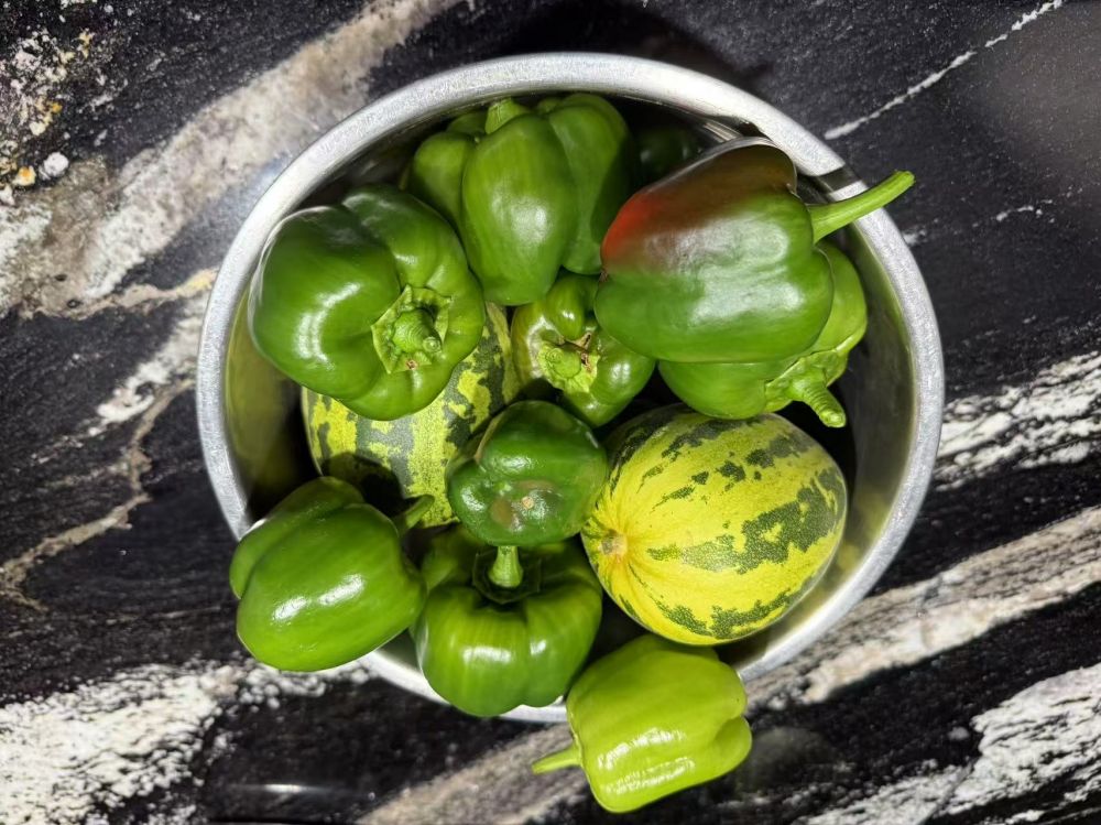这周收获,主要是香瓜和辣椒。西红柿,黄瓜苗等估计被chipmunk,兔子等吃了