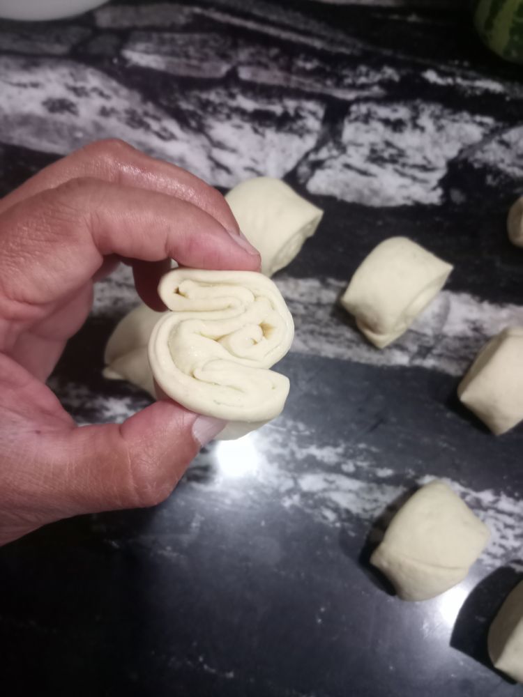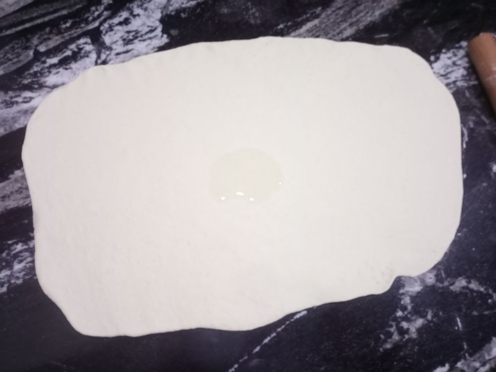 如果发面过度就多揉些,正常折叠几下把大气泡按出就好,擀成薄皮抹油撒盐