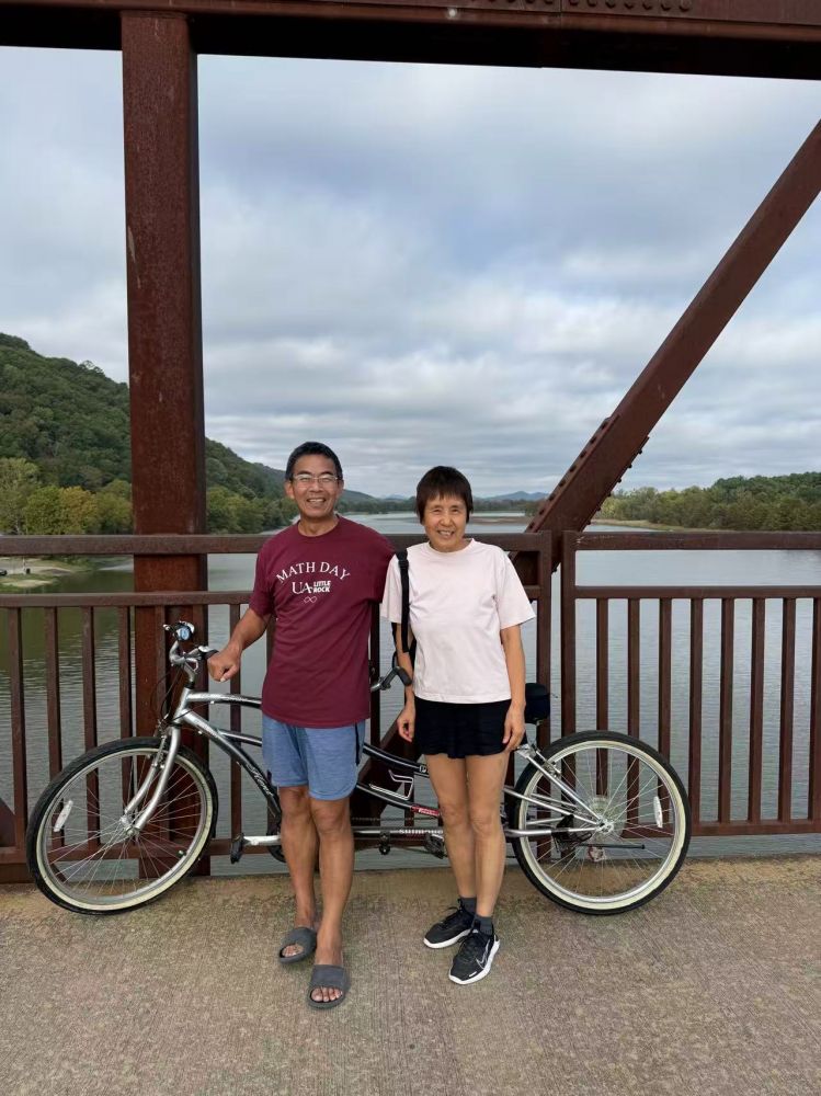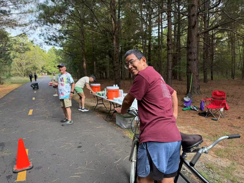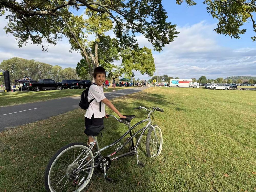 看热闹不嫌事大,我们骑上双人自行车从江边过步行桥去,也是今年第一次骑车,看到路边的志愿者才发现原来是长跑比赛活动