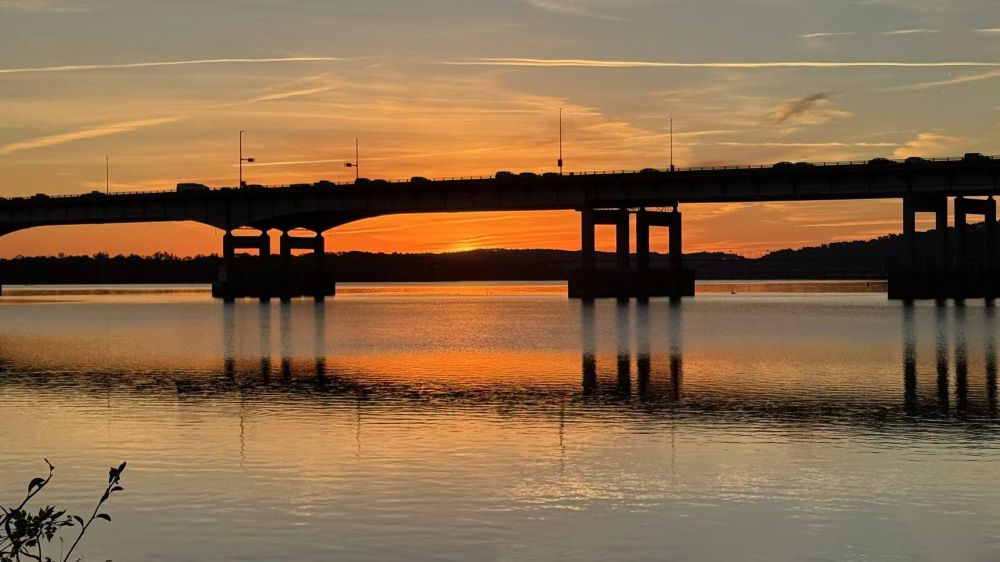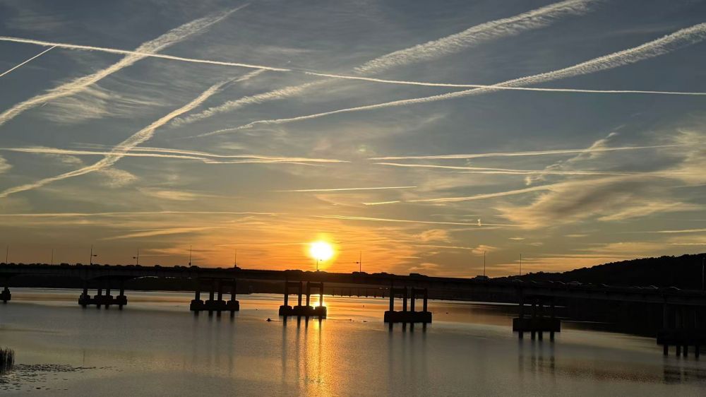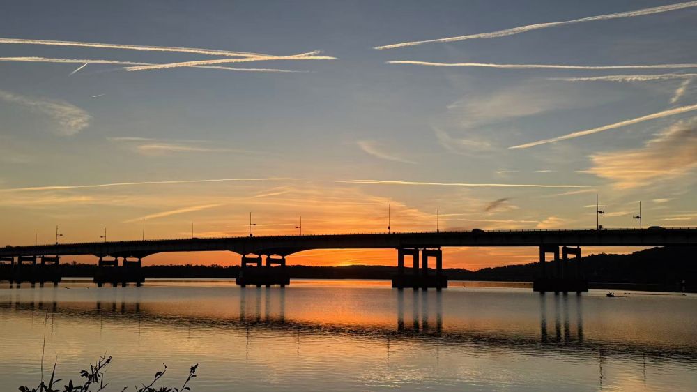 带朋友去看日出,注意天上飞机训练划出了很多的线条,增添了色彩