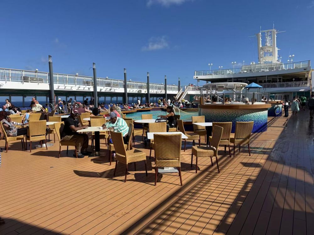 这次10天邮轮本来是停6个地方有4天在海上,登船后才被告知最后的墨西哥取消了这样有5天是在海上。和我们一起去的另外两女生都不会玩牌但我们还是带了牌,上船第一天就碰到了加州的夫妻做牌友玩两副牌的升级,船上的娱乐活动很多但也有很多是需要英文的如music trivial使得海上的日子丰富了很多。邮轮上有5个免费餐馆和大约5个要花钱的餐馆,我最喜欢的还是免费的自助省时简单,游泳池的水是海水