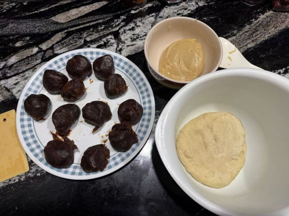 我昨晚给他们做了酥饼,豆沙馅料加油,糖,桂花糖炒好分成12份,准备酥皮和油皮