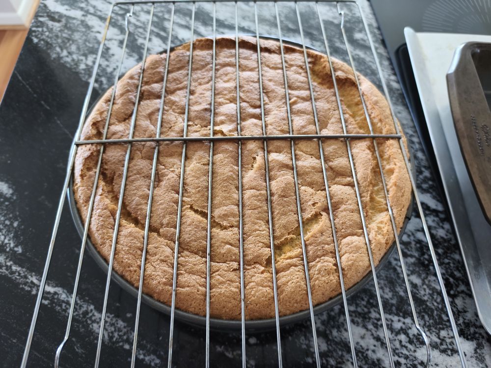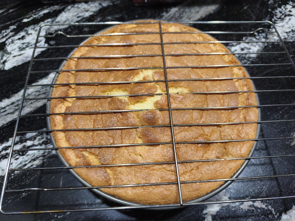 这是冷却2小时后。戚风蛋糕最常见的问题是塌陷,如果有倒置那原因肯定是烤的时间不够,胆子大点让蛋糕烤的有点发黑肯定就不会塌陷了,味道不会差多少。