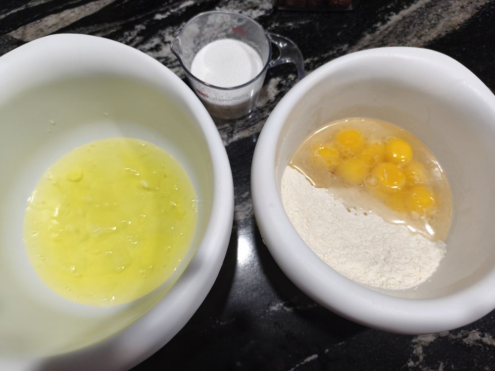 开始打鸡蛋,一共9个Large(以前我是用6个,一次朋友用了15个还不错,就是太麻烦所以现在我用9个)蛋白入大容器,蛋黄入小容器,蛋白一定不能有蛋黄因为蛋黄有油,少量要尽量捞出但一定会影响蛋白打发,不小心散黄了一起放入蛋黄容器即可,