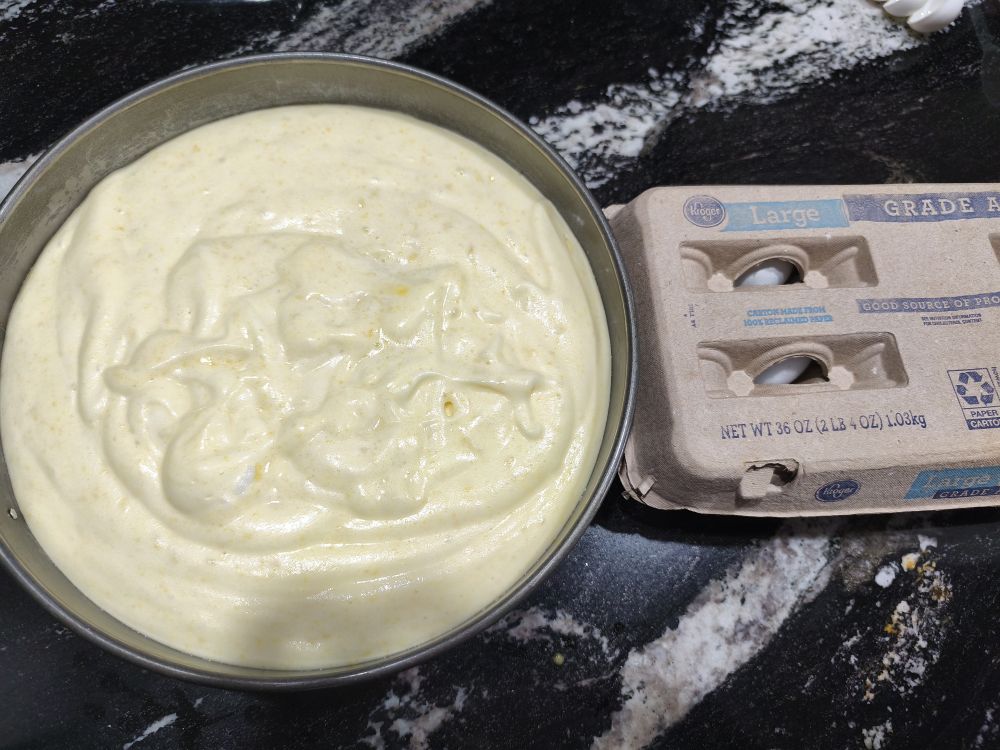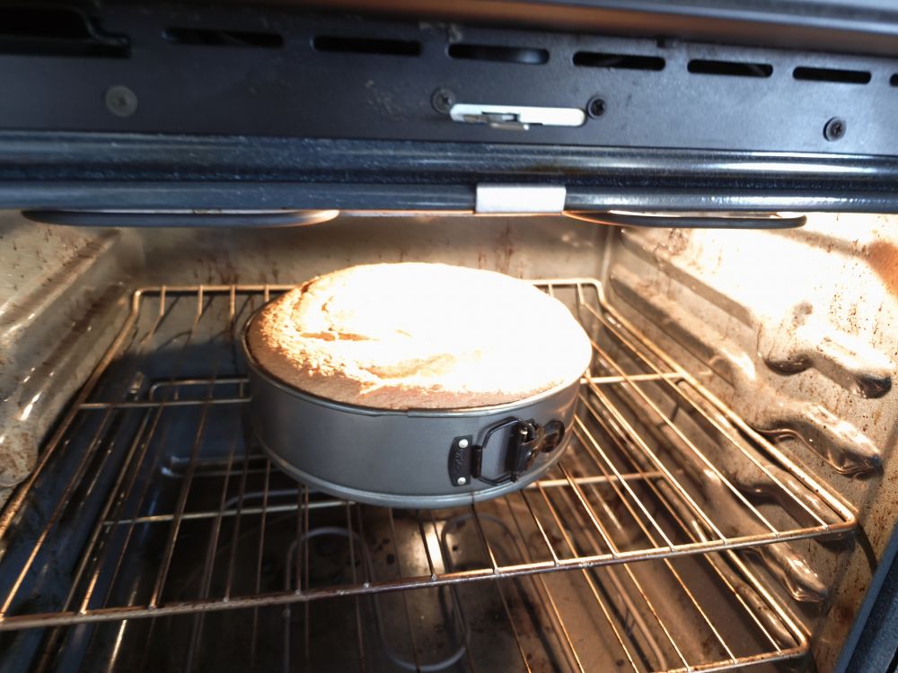 打开烤箱放320度,我从来不喜欢预热不环保,可以在等温度上升时把东西收拾一下,时间上基本是正好烤箱过了200度,蛋糕液体也有点放置时间让气泡浮到表面,轻磕烤盘把大点的气泡弄破,放入烤箱定时30分钟。一共烤55到60分钟,不过我一般喜欢放一半时间看看,根据情况再决定延长25或30分钟。我这次烤出来有明显裂缝,估计是泡打粉放多了点