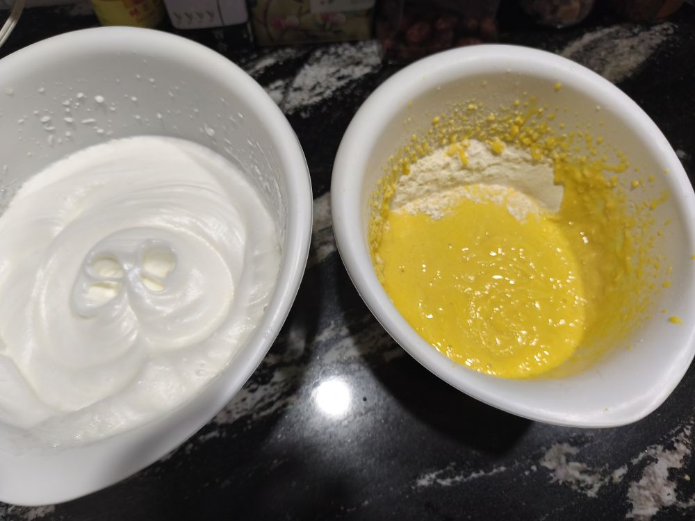 用一个刮刀搅拌蛋黄和面粉,注意如果太干可以加放一点水,或者把蛋白弄一刮刀过来加入,搅拌均匀后倒入蛋白容器的边边上,在蛋黄蛋白搅拌的过程中注意尽量搅拌蛋黄部分,逐步加入蛋白,简单原理就是在混合过程中尽量少搅拌蛋白,动作要快一点这里男生的力量有优势。看看我这里似乎有颗粒状蛋黄应该是蛋黄搅拌的时候不充分可能是太干了