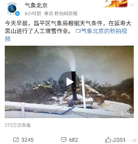 不过,北京市气象局官方微博〝气象北京〞当天发布的一段影片引起了网民的注意。微博上的这条资讯称,17日早晨有关机构在北京昌平区〝根据天气条件在延寿大黑山进行了人工增雪作业〞。