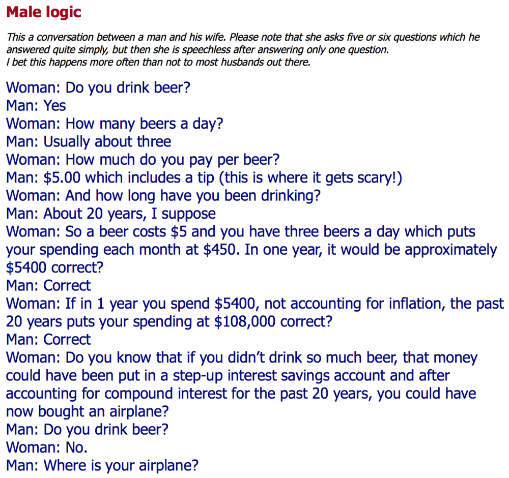老婆跟老公算了笔帐:一天三瓶啤酒$15,20年是。。。