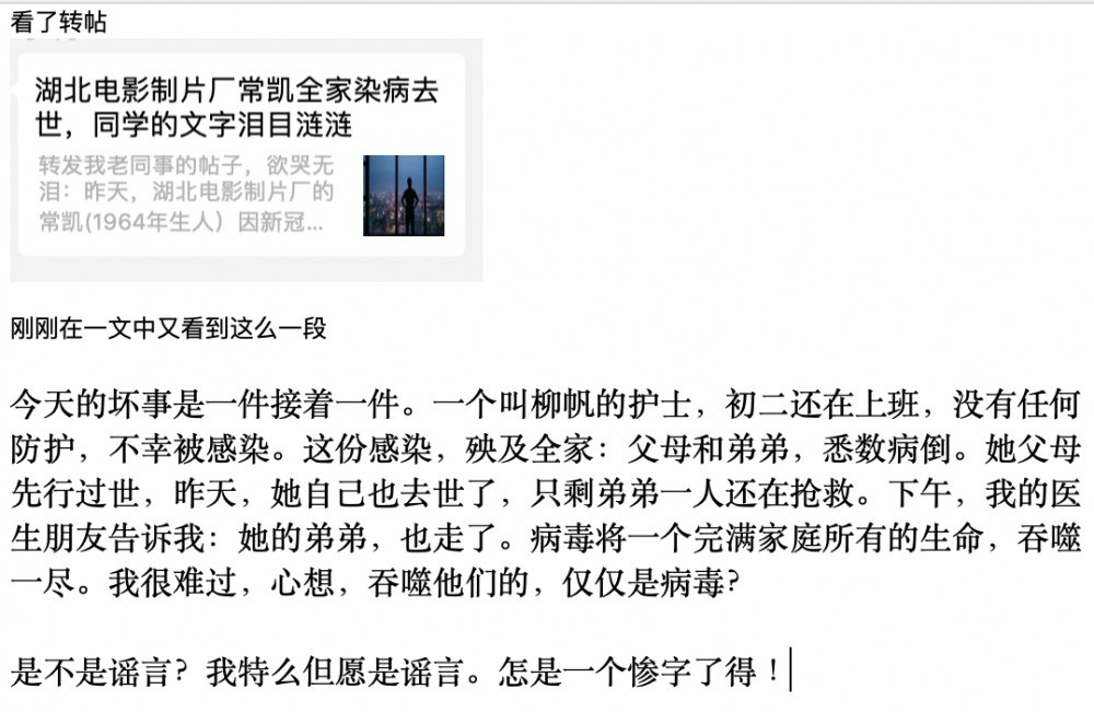 今天的坏事是一件接着一件。一个叫柳帆的护士,初二还在上班,没有任何防护,不幸被感染。这份感染,殃及全家:父母和弟弟,悉数病倒。她父母先行过世,昨天,她自己也去世了,只剩弟弟一人还在抢救。下午,我的医生朋友告诉我:她的弟弟,也走了。病毒将一个完满家庭所有的生命,吞噬一尽。我很难过,心想,吞噬他们的,仅仅是病毒?