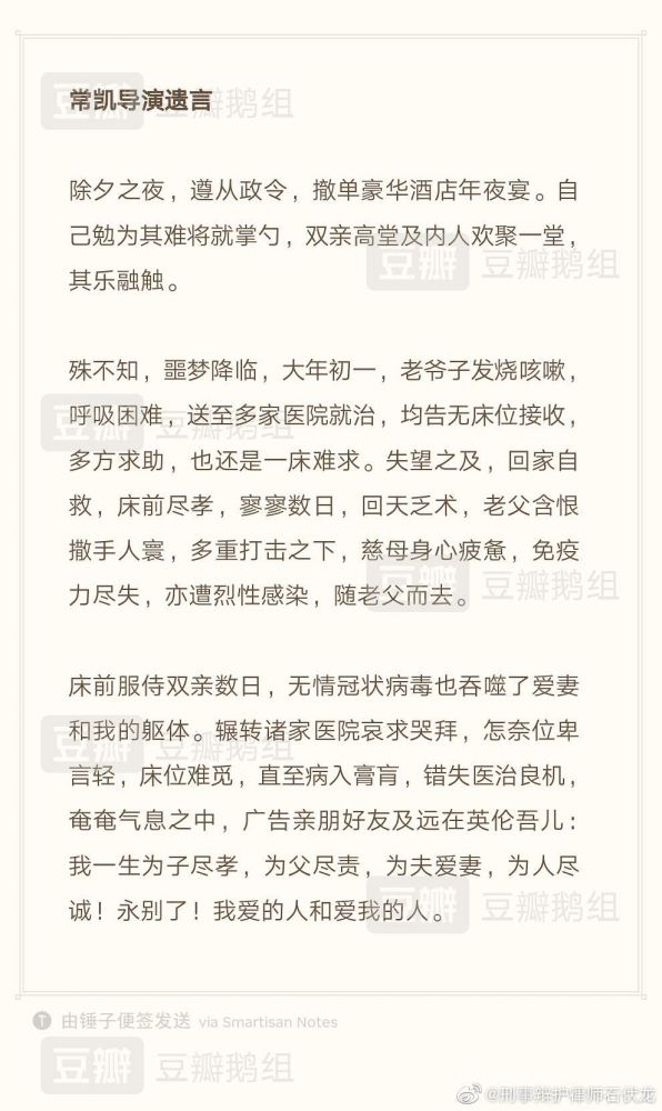 大年初一我们相互致电互拜新春,没想到初三你的老父亲走了,初九你的老母亲又紧随其后,情人节的清晨你走了,而当天的下午你的姐姐又随你而去!仅仅第十七天你一家四口遭遇了灭门之灾,冤屈的灵魂飘浮在阴霾笼罩的武汉天空之上,如此人间悲剧令人心痛崩溃,让苍天无言解答!看着一周的时间你的父母双亲离你而去,而你却无法送父母最后一程,我无法想象你当时悲伤与凄凉。而此时你知道你和夫人还有回家过年的姐姐都被感染罹换沉珂,而史无前例的封城让你只能无处求助,残酷无比的病人等床让你只能是在家隔离等待病床。你明白此劫难逃,带着你对这个世界的恋恋不舍,你留下了人世间的最后一段话:除夕之夜,遵从政令,撤单豪华酒店年夜宴。自己勉为其难将就掌勺,双亲高堂及内人欢聚一堂,其乐融触。殊不知,噩梦降临,大年初一,老爷子发烧咳嗽,呼吸困难,送至多家医院就治,均告无床位接收,多方求助,也还是一床难求。失望之及,回家自救,床前尽孝,寥寥数日,回天乏术,老父含恨撒手人寰,多重打击之下,慈母身心疲惫,免疫力尽失,亦遭烈性感染,随老父而去。床前服侍双亲数日,无情冠状病毒也吞噬了爱妻和我的躯体。辗转诸家医院哀求哭拜,怎奈位卑言轻,床位难觅,直至病入膏肓,错失医治良机,奄奄气息之中,广告亲朋好友及远在英伦吾儿:我一生为子尽孝,为父尽责,为夫爱妻,为人尽诚!永别了!我爱的人和爱我的人。