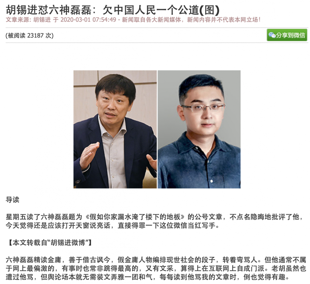 回头又看了遍花露水的文章感觉胡锡进才的逻辑不通。中国出现全球第一例武汉肺炎是一回事,中国的牺牲又是另一回事。不能因为自己的损失惨重就不提对别人的伤害了。胡锡进欠世界人民一个公道!