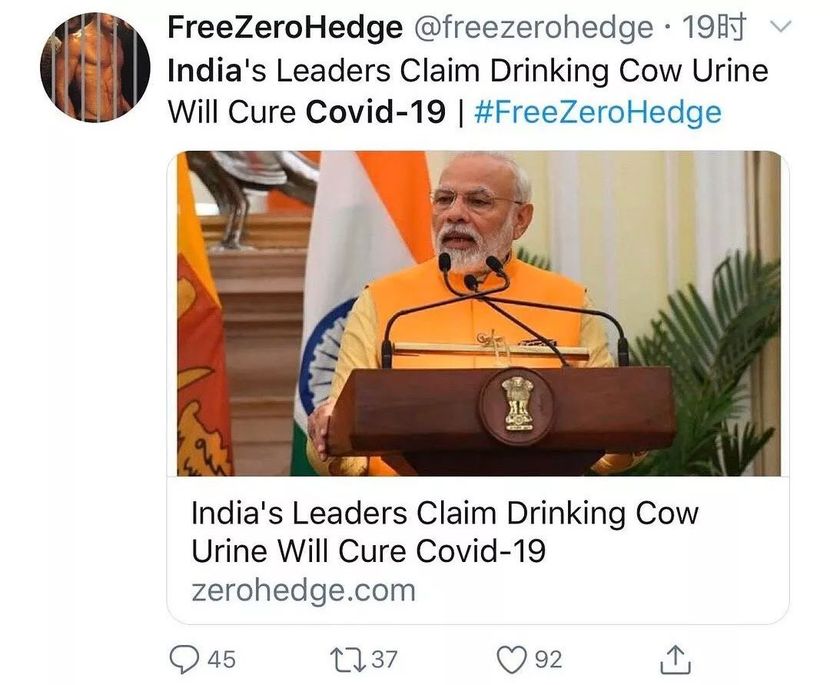 而且他怕被灌牛尿,印度人相信那玩意有奇效,既富含营养,又可以滋补心灵,而且这不是部分印度人的观念,是印度的国家共识,前几天那个印度总理还在说 " 牛尿可以治疗冠状病毒 ",今天印度卫生部的人也在提倡牛尿,印度大街上就有卖瓶装的牛尿,印度的很多饮料和饼干里都加了牛粪牛尿,全方位地保护印度人的身心。