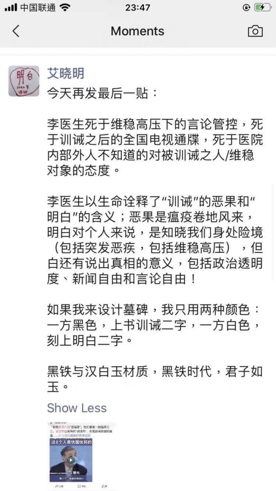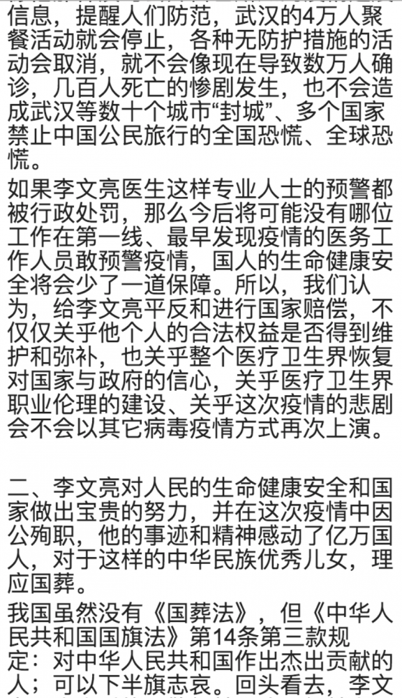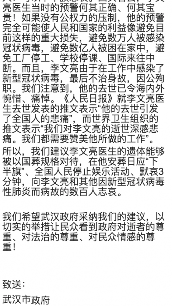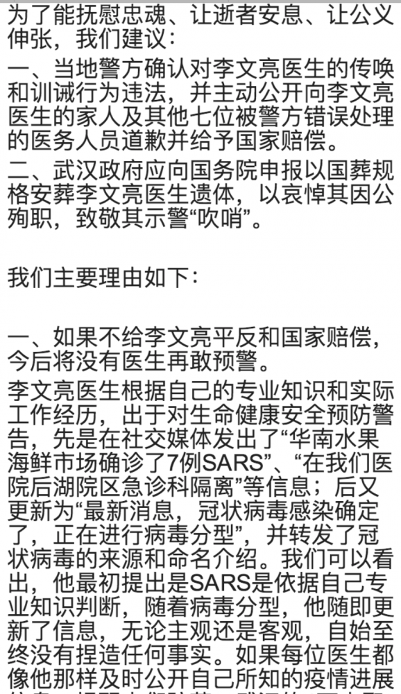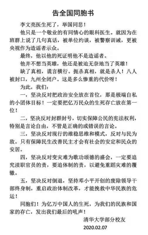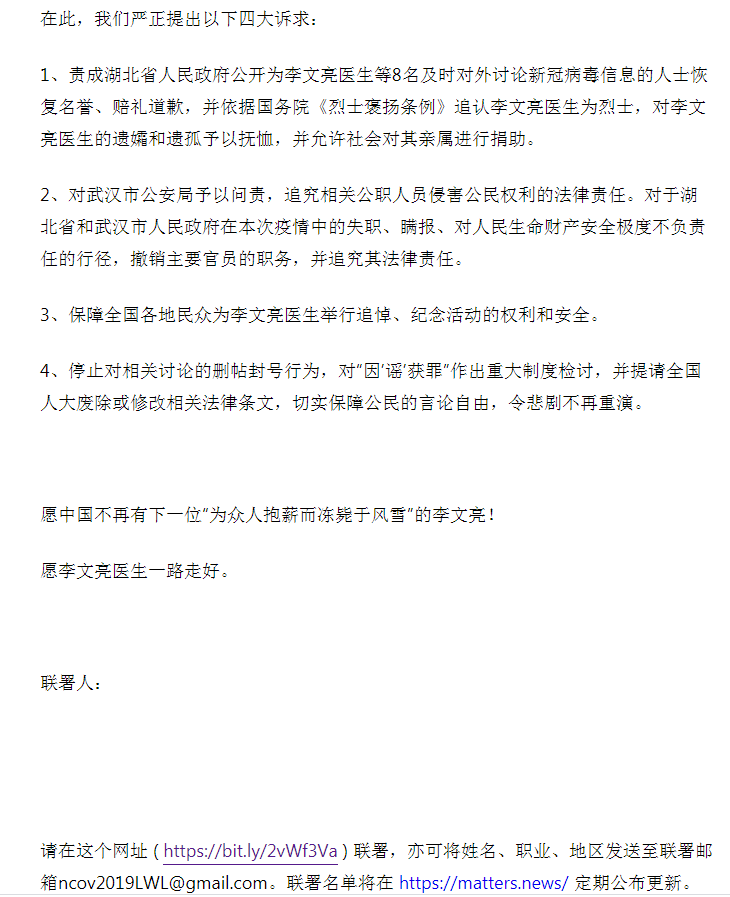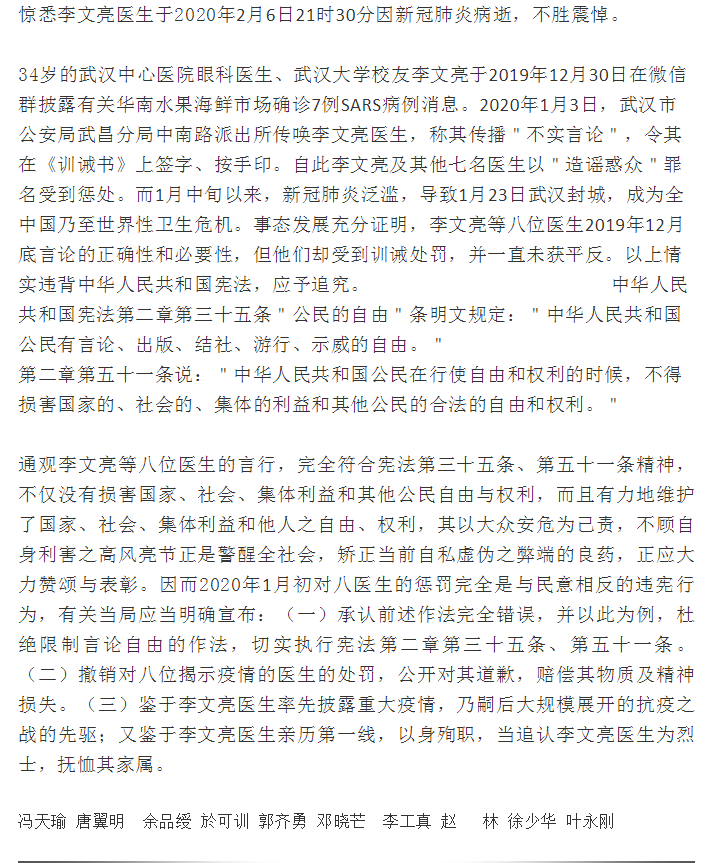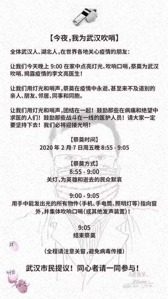 2月6日晚,李文亮医生因新冠状病毒肺炎去世。作为此次疫情的吹哨人之一,李文亮医生的突然去世,在民众激起激烈的反响,自发组织各种活动来纪念李文亮医生,同时也表达对当局的不满,提出政治诉求。他们或是提出倡议书;或是用行动表示;或是发表明明知道会被立即删除的文章;或是在自己的社交网络用图片文字来表达。特收集部分倡议书和照片、漫画于此。