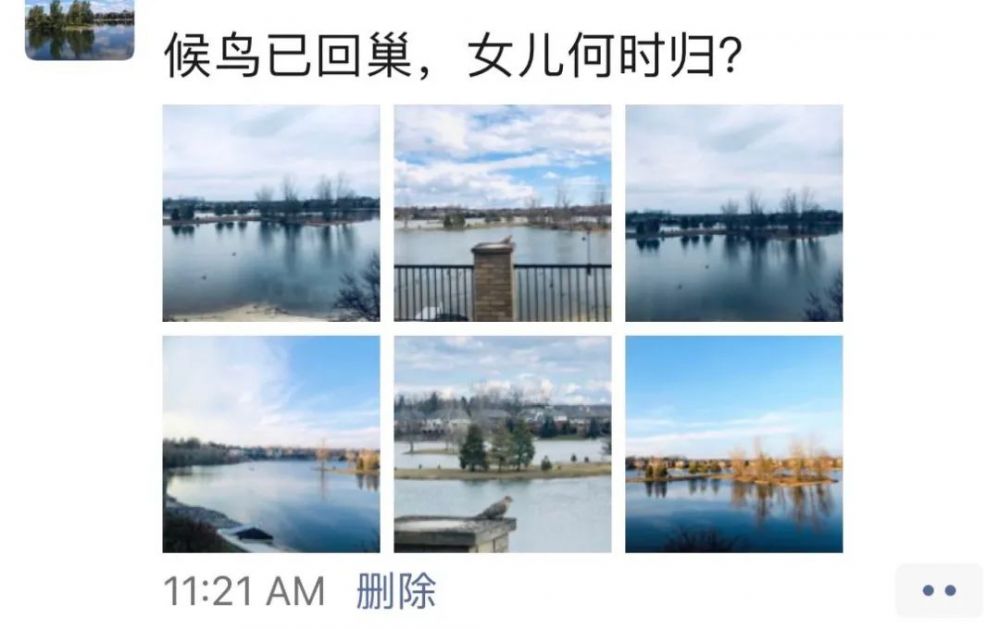 一会儿,看到一只鸟儿落在了屋后的露台上,静静地卧在那里一动不动,和我分享这眼前的安宁。我拿起手机把它拍了下来,连同这眼前的静好发到了朋友圈,写道:候鸟已回巢,女儿何时归?