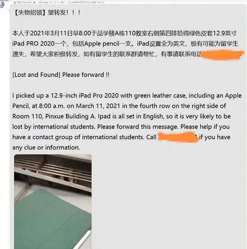 据“阿西西的圣弗朗西斯”自述,他是一名男生,电子科技大学本科一年级学生,3月11日早上8点,他在教室座位抽屉里捡到一个绿色皮套12.9英寸的iPad Pro 2020和一支Apple Pencil。