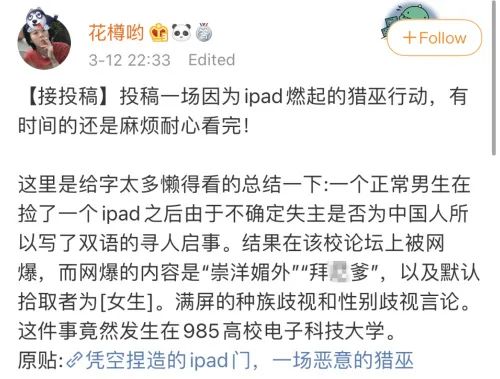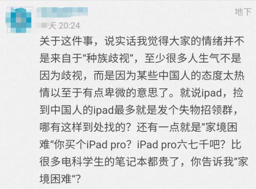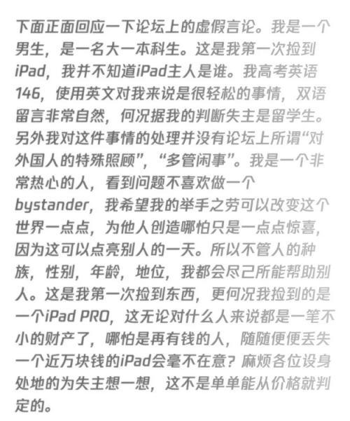 3月12日,自称拾取者的网友“阿西西的圣弗朗西斯”发布长文解释称,自己是一名大一男生,看到iPad Pro内语言设置为英文判断失主可能是留学生,故发布了双语失物招领,只是出于热心,没想到因此遭遇了“网暴”。