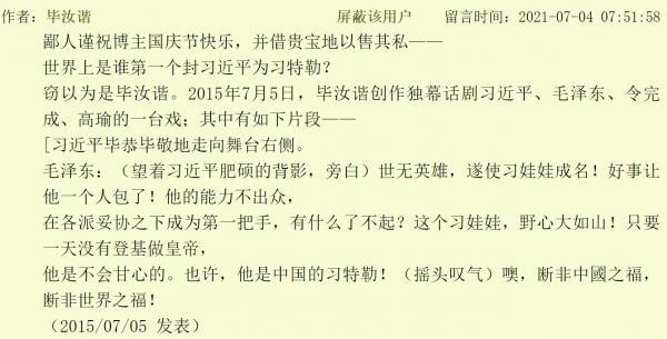 不幸的是,现实狠狠的扇了毕汝谐一巴掌,他的推特关注量至今不足二百人,YouTube单视频点击量不过50次,几套灰色电子书以20美元售价几乎无人问津,还时不时被一些民运同行讽刺其请代笔,且只能靠性话题乞求关注。由于年迈思维固化,新文章除了回望前半生风流史,或是感叹世事对己之不公,亦或是蹭热度的天马行空式乱造,导致网粉们渐渐看倦了,厌了,渐渐变成了路人,似乎不曾出现......