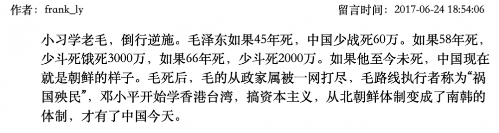 习近平是山寨版毛泽东 毕汝谐(作家 纽约) 两年来,习近平励精图治,力求成 为毛泽东第二;习近平照葫芦画瓢,毛泽东干啥他干啥;毛泽东有古田精神,习近平也借周年纪念去古田走一遭;毛泽东有延安文艺座谈会,习近平也举办北京文艺座谈会;天公作美,习近平与晚年毛泽东的形象有几分相像:脸润身肥,端正无须,然毛习二人之才禀判若云泥,两相对比,如同李鬼效法李逵,孜孜努力而愈益自曝其短,习近平活脱脱是山寨版毛泽东! |