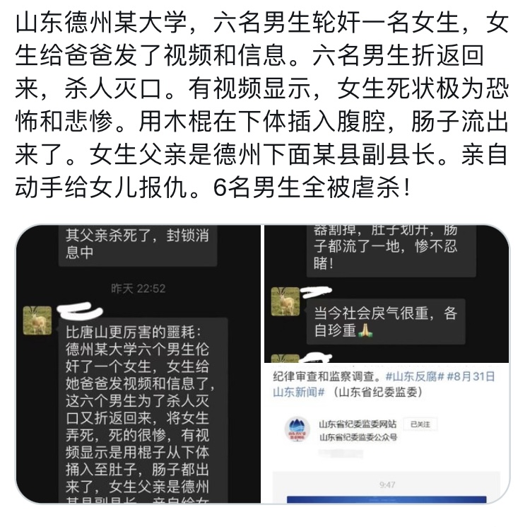 山东德州某大学6男生轮奸1女生……
