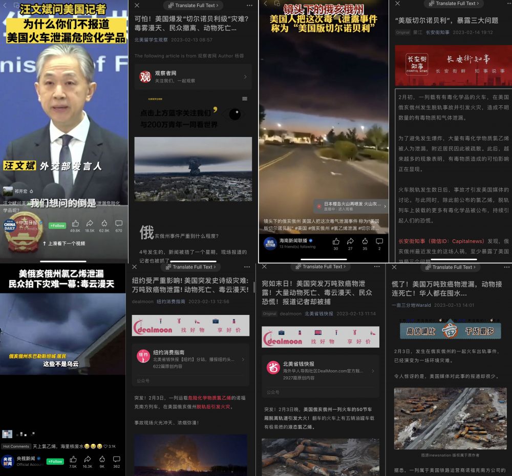 部分中国媒体对俄亥俄火车脱轨致化学品泄漏事件的报道截图