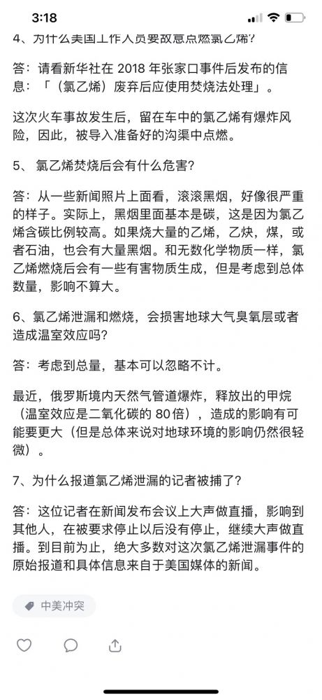 不过,在2月15的《新闻直播间》节目中,中央电视台则质疑俄亥俄州当地政府“两天后就宣布事故区域居民空气质量符合空气质量标准,疏散居民可以安全回家。”并详细解读氯乙烯的危害,称当地民众担忧生存环境遭到污染。
