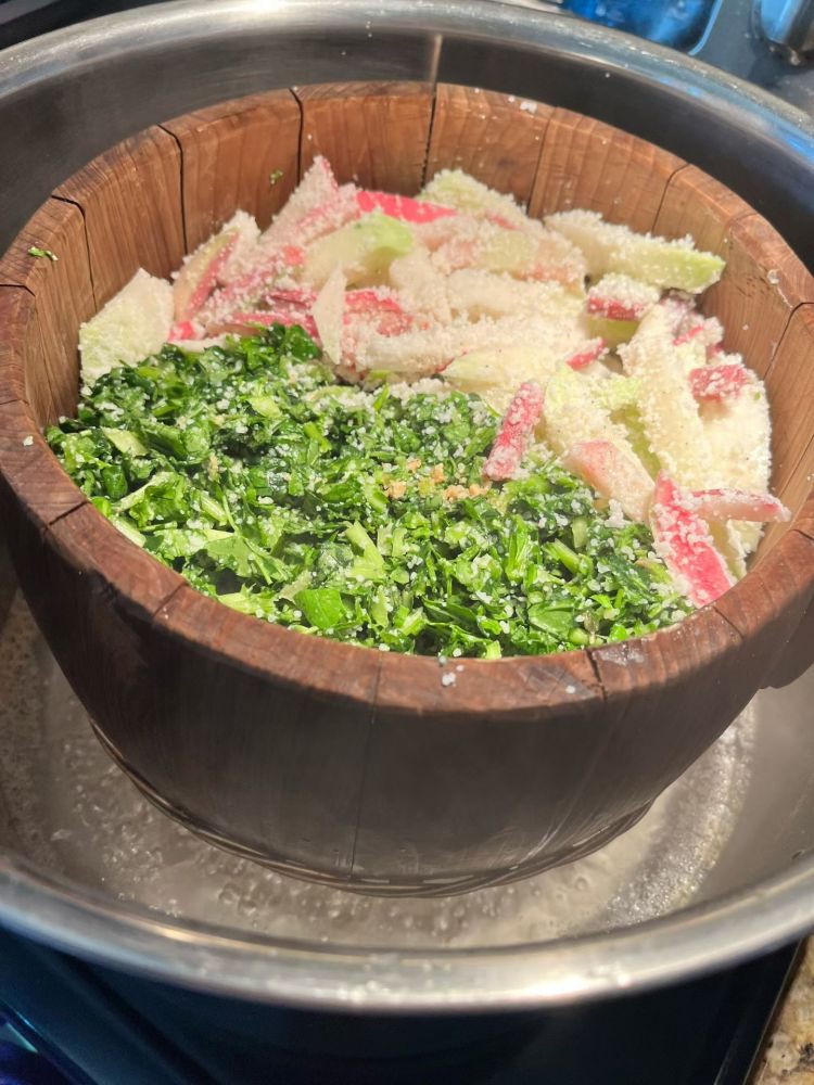 开启中秋大餐模式。吃什么?小时候最喜欢的粉蒸肉啊。拿出杉木甑,捞一锅米饭垫底,中间铺上萝卜蒸菜,还有荠菜加黑白菜蒸菜,最上面是粉蒸肉。特殊的炊具,做出来特殊的风味。每一层都是香喷喷,吃不厌呀。