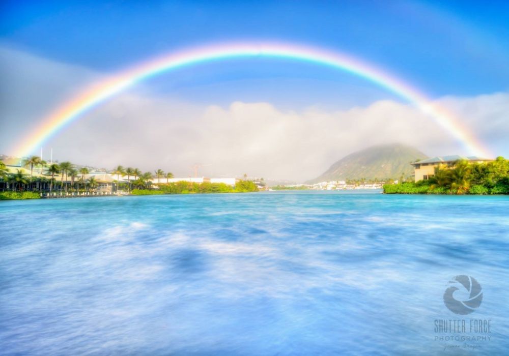蓝蓝的天上白云跑, 金色阳光中细雨飘。 七色的彩虹空中挂, 谁的手绘出这最美的画?