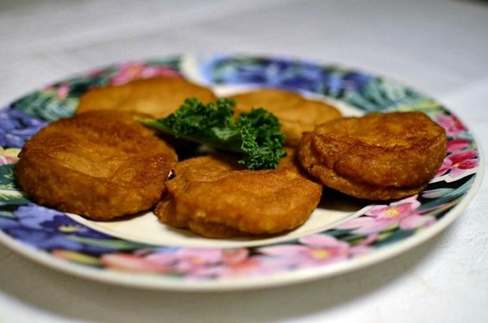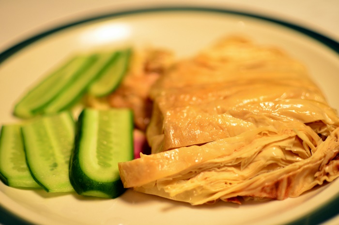 素鸭:这张没照好,应该是拿手的,做了好多年:)。买新鲜的豆腐皮,或冰冻的,水里浸二十秒,不能太久,会太软。蚝油和糖搅匀,拿两张皮,涂匀,1/3处往上卷,再左右叠,平底锅,油里两面小煎,等凉,切条。