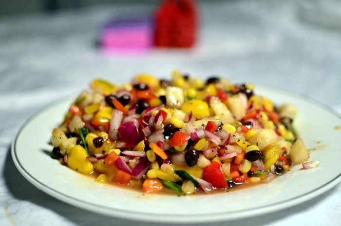 做过无数次的干吧吧的墨西哥豆色拉:你可以变换,放不同的素菜和水果,万变不离其宗,sauce 按配方就行。