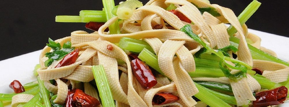 干炒豆腐皮芹菜丝:豆腐皮切丝,芹菜水里抄一下,起油锅,辣椒放进去到香味出来,一起放进去翻炒,加盐,胡椒粉,一点鸡精,也可以不放,盛出即可。