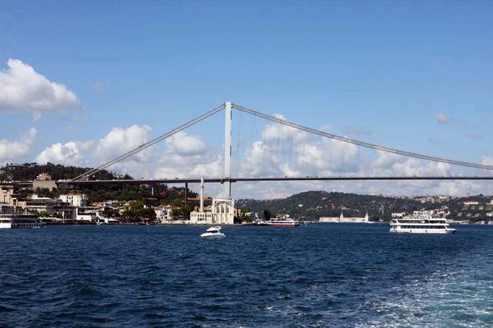 提起伊斯坦布尔,人们自然又会联想起世界上唯一飞跨欧亚两洲的博斯普鲁斯海峡大桥。土耳其政府于1970年开始动工兴建博斯普鲁斯海峡大桥,到了1973年10月30日,举世闻名的第一座连接欧亚两洲的大桥“博斯普鲁斯海峡大桥”,又称博斯普鲁斯海峡吊桥,它的雄姿以及秀丽的海峡风光和素负胜名的千年古迹,使伊斯坦布尔成为世界著名旅游胜地。这是一座造型独特的吊桥,全长1560米,除两头的钢架外,中间没有桥墩,各种类型的船只都可通过,是欧洲第一大吊桥,世界第四大吊桥。入夜,桥上华灯齐明,远远望去,宛如巨龙凌空,非常漂亮!