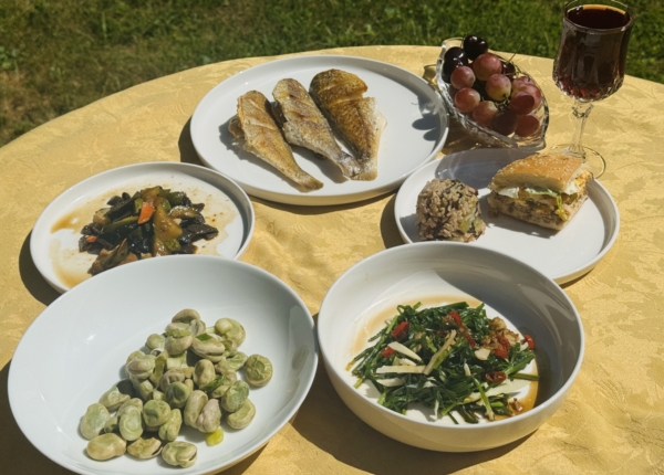 野生小黄鱼用盐和胡椒粉腌一下,空气锅炸,外脆里嫩,很好吃。清炒蚕豆,凉拌黄瓜木耳胡萝卜,菜饭,LD的一小块三明治,凉拌韭菜(新配方)。